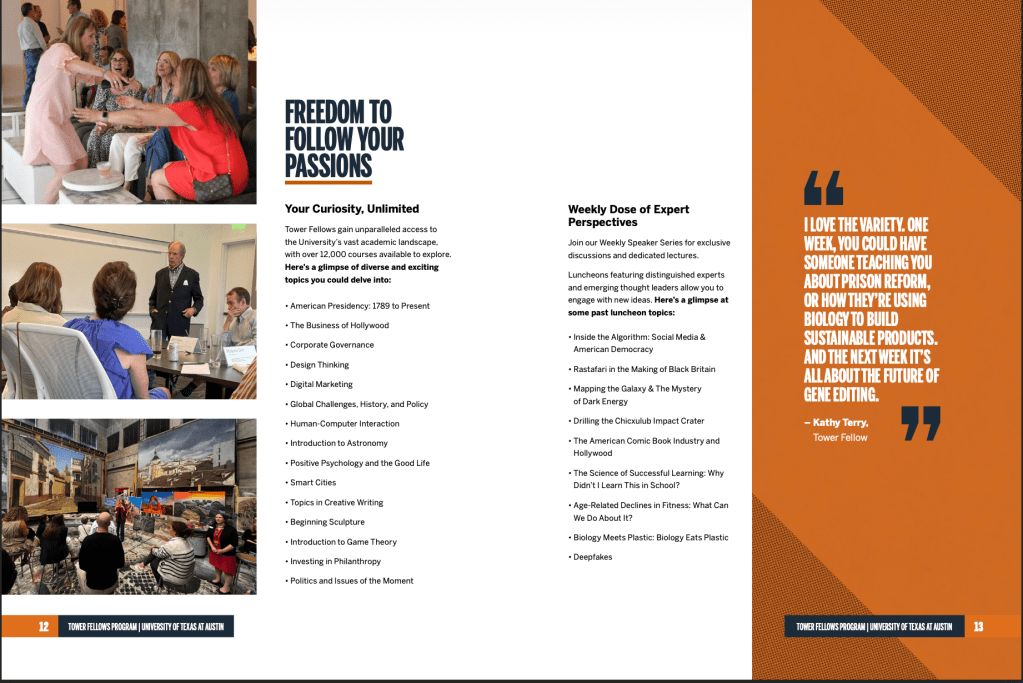 A designer and I created this viewbook to be used as a print piece for on-campus events. The Tower Fellows Program is a two-semester immersive experience for accomplished retirees looking to explore their next chapter in life. Below is a sampling of pages from the finished viewbook.