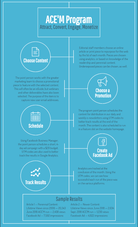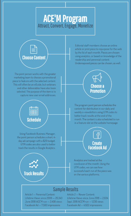 This piece shares how to start an intentional content marketing program. It used Lessiter Media’s own ACE’M Program (Attract, Convert, Engage, Monetize) as an example of how to get started. The ACE’M Program was something I was the point person for during my time at the company. You can read the full article here.