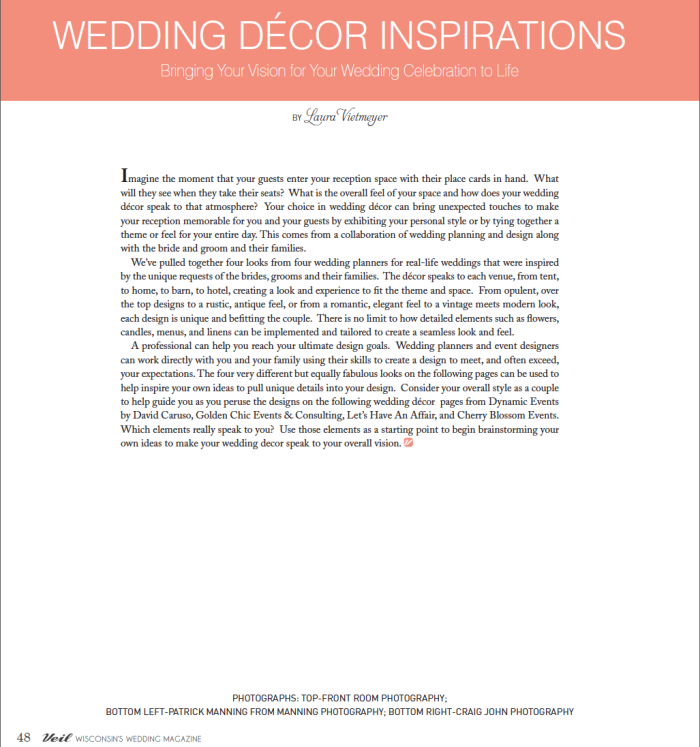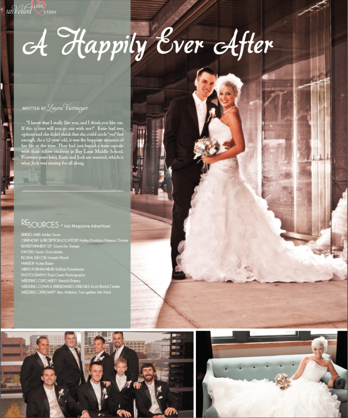 Veil Magazine Writer, Oct 2013 – Dec 2020 Write feature articles focusing on newlyweds, bridal fashions and vendors Represent Veil at Milwaukee’s Magnificent Bride Show Managed social media and article posting on Facebook, Instagram and Wix-hosted website Share this: Click to share on X (Opens in new window) X Click to share on Facebook (Opens in new window) Facebook Click to share on Pinterest (Opens in new window) Pinterest Like Loading...